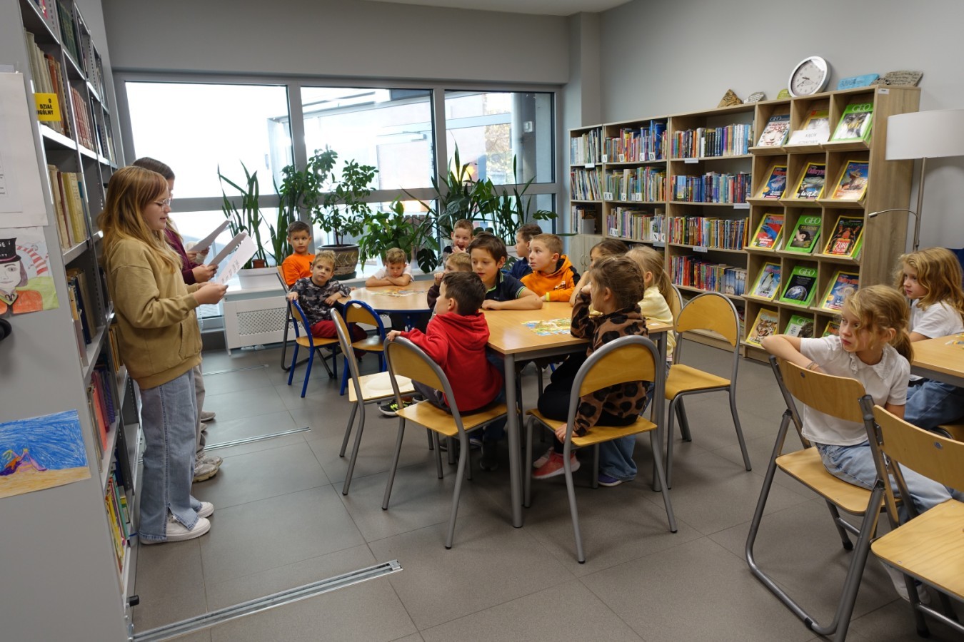 W dniu 31 października w bibliotece odbyło się pasowanie na czytelników uczniów klasy 1a i 1b. W podróż do stacji Biblioteka zabrały pierwszaków uczennice z klasy 6b : Laura, Zuzia i Maja. Na każdej stacji czekało na nich zadanie do wykonania: układanie puzzli - postaci z książeczki o Franklinie, zagadki dotyczące znanych bajek, prośby książeczki oraz uroczyste pasowanie i wręczenie zakładek. Dzieci zostały zapoznane z regulaminem biblioteki i czytelni szkolnej, a także mogły wypożyczyć swoją pierwszą książeczkę.