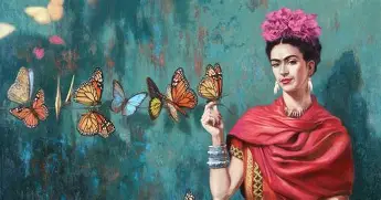4. Autoportret – należy przedstawić siebie, nawiązując do stylistyki twórczości Fridy Kahlo. W tle mają pojawić się elementy roślinne i zwierzęce, kolorystyka jaskrawa, intensywna.