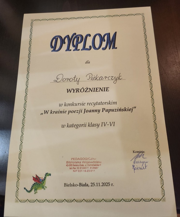 NASZ UCZENNICA DOROTKA PIEKARCZYK ZDBYŁA WYRÓŻNIENIE
